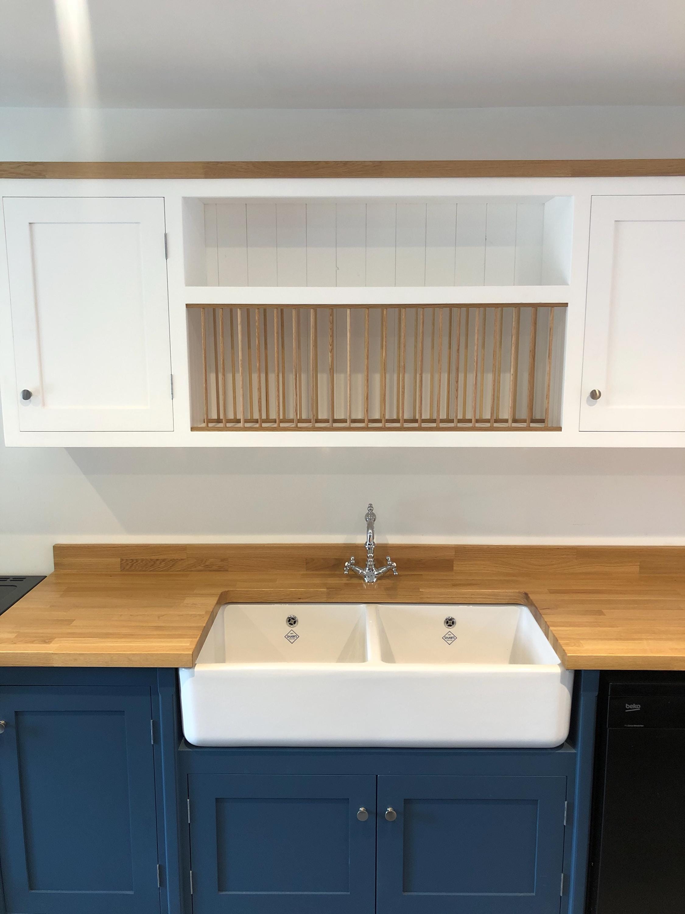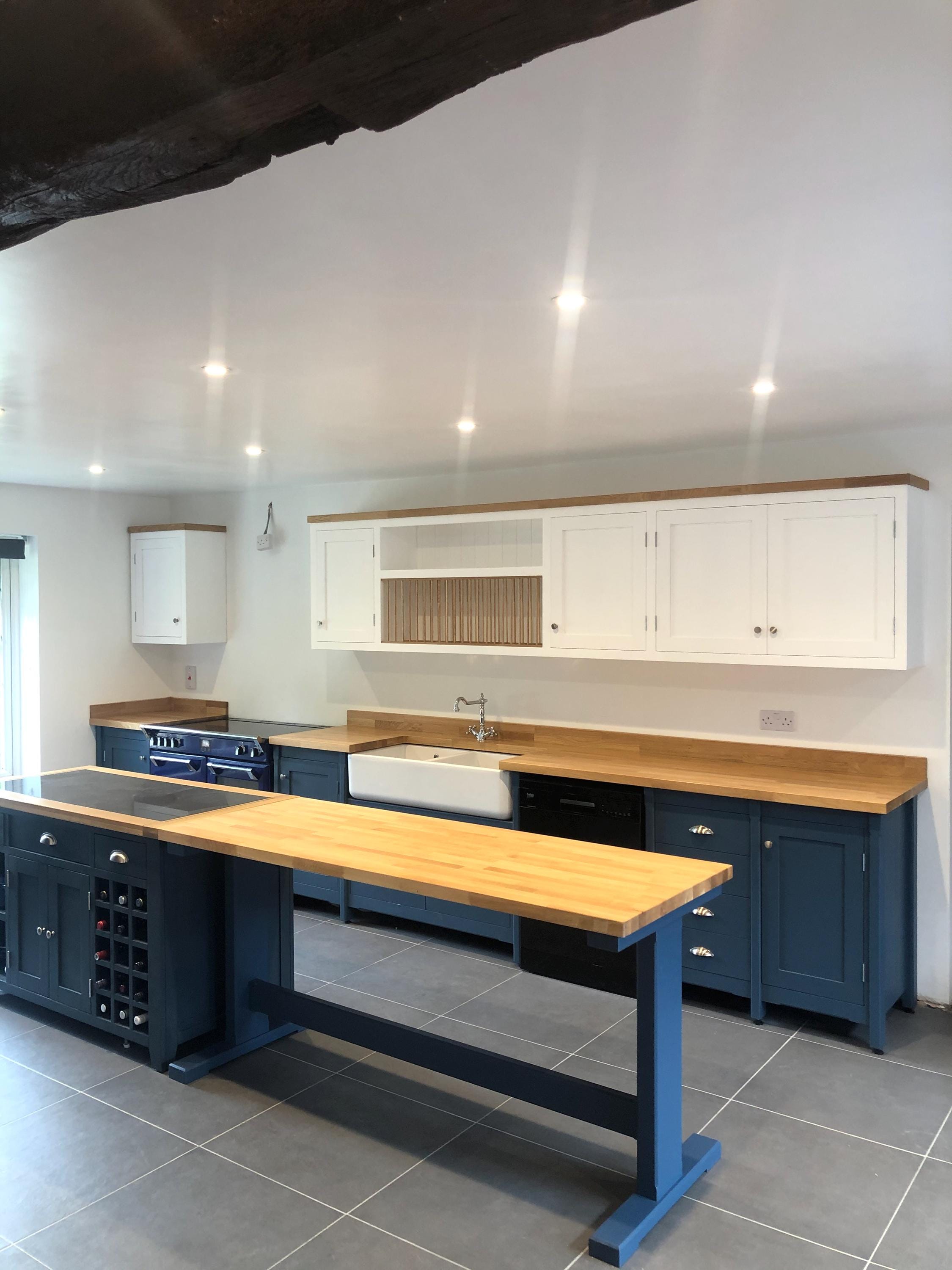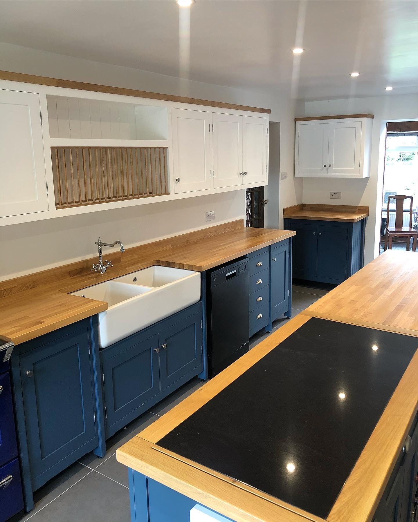 This bespoke shaker kitchen is handmade to order in our workshop and designed specifically for your space. Featuring freestanding units, a double Belfast sink, and solid wood worktops, this style combines traditional craftsmanship with practical modern kitchen design.