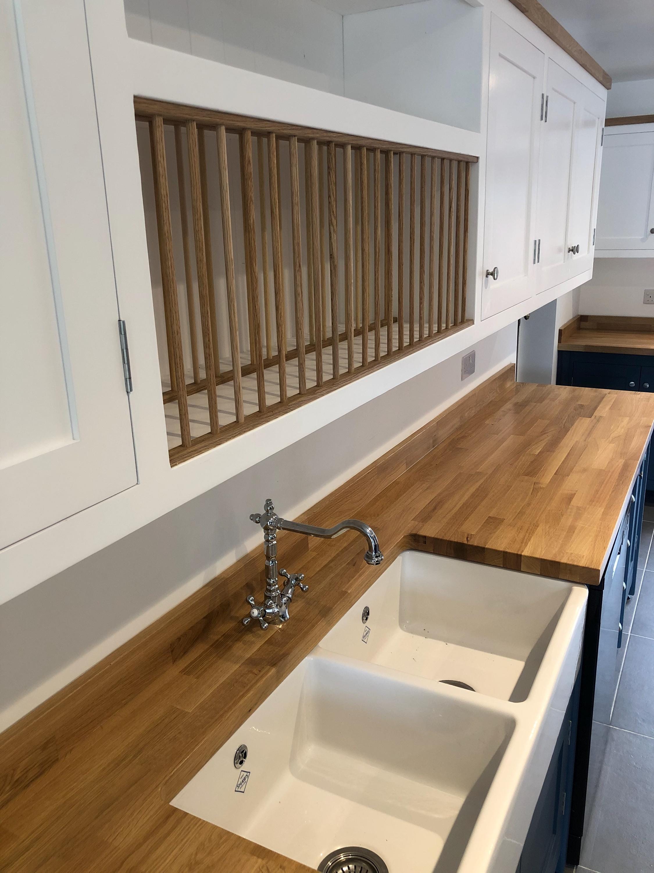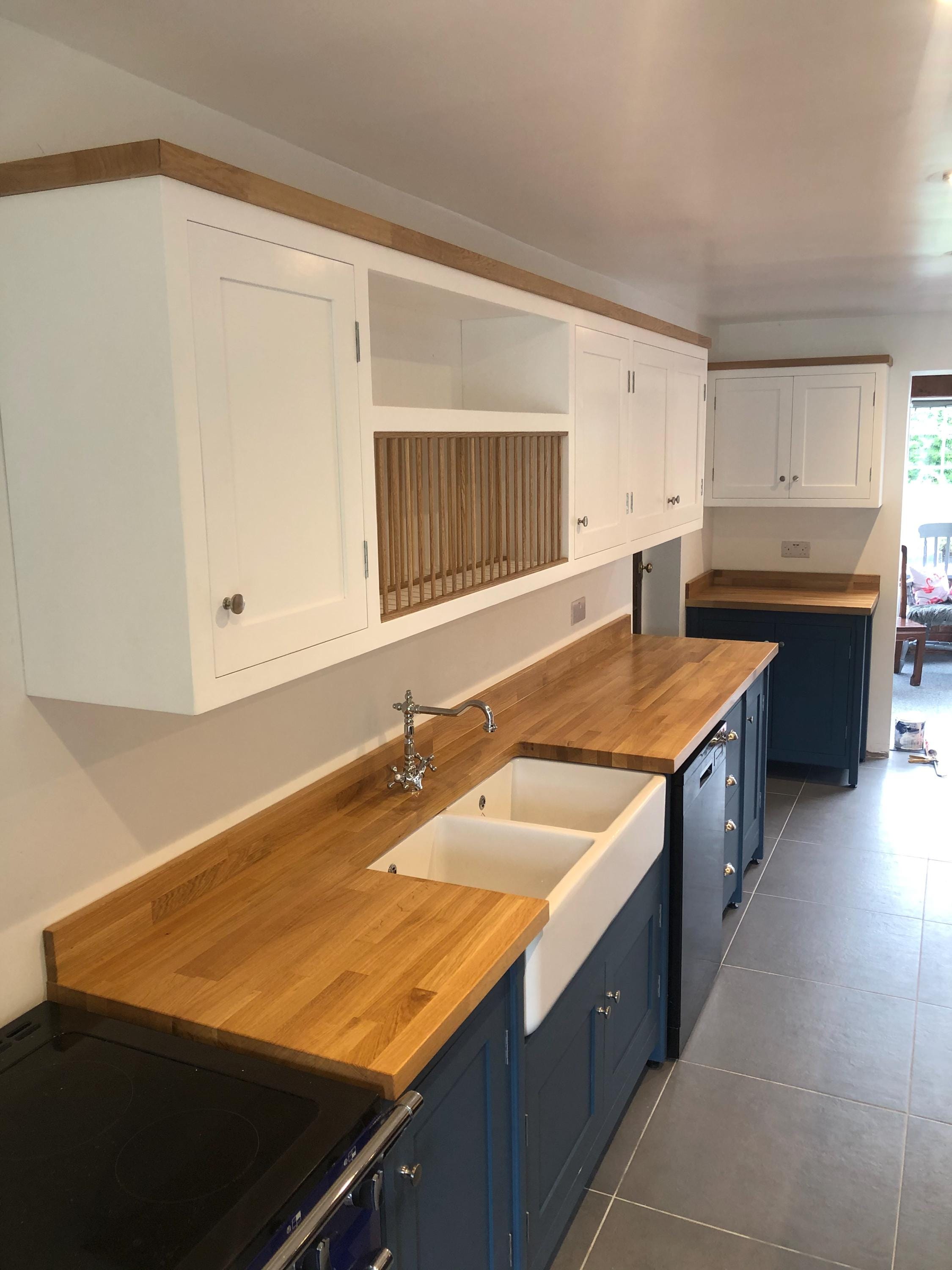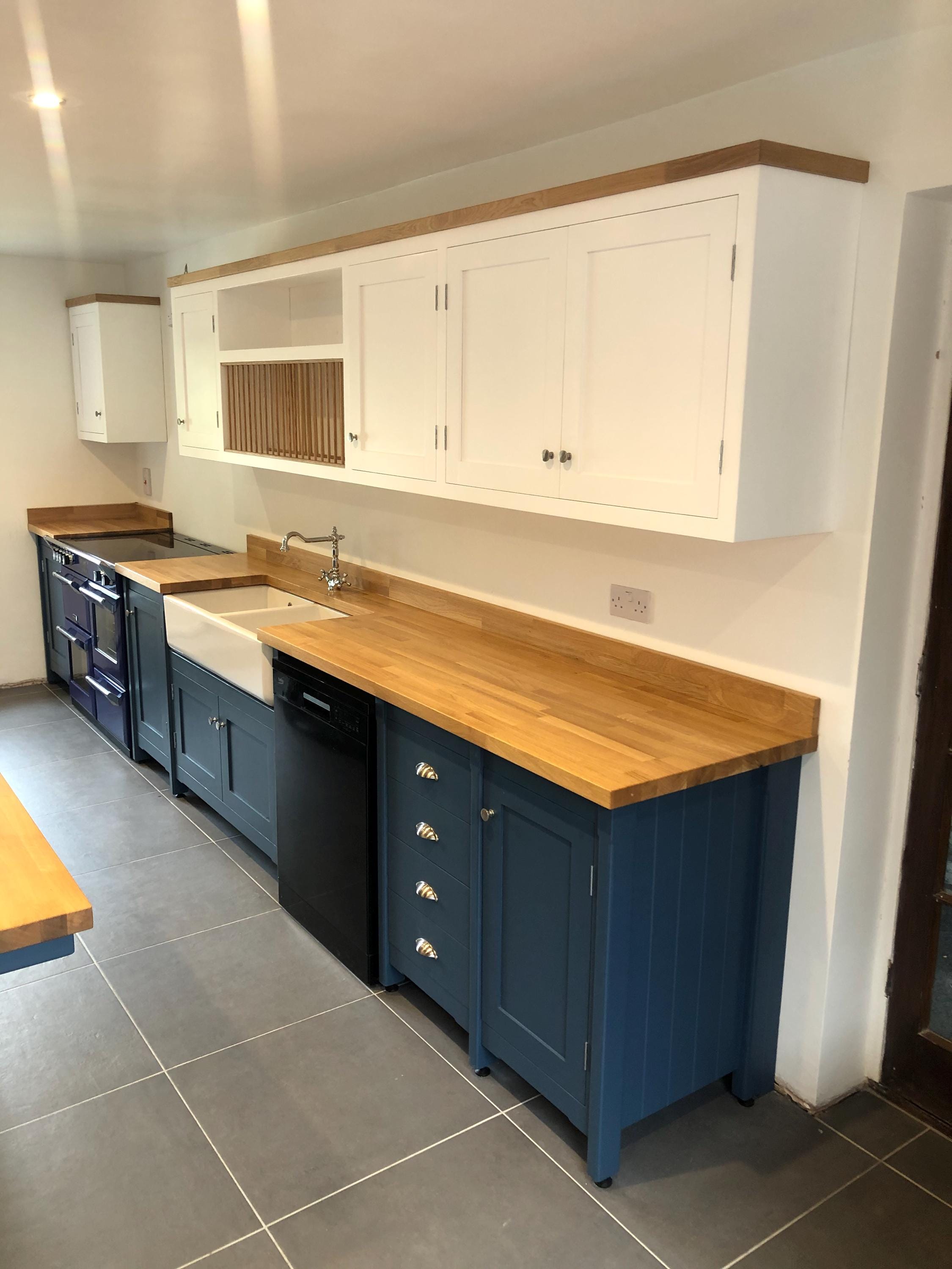 This bespoke shaker kitchen is handmade to order in our workshop and designed specifically for your space. Featuring freestanding units, a double Belfast sink, and solid wood worktops, this style combines traditional craftsmanship with practical modern kitchen design.